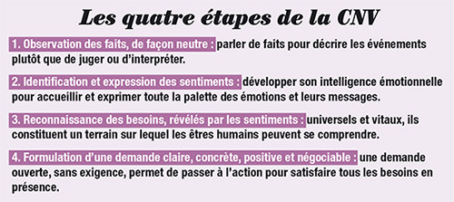 Au sein des équipes, le processus de la CNV permet de clarifier les enjeux, faciliter la prise de décision et la mise en œuvre de projets. La pratique de la CNV permet de développer un climat de confiance, de coopération et de solidarité entre collègues, quel que soit le rôle de chacun. Elle apprend à exprimer ses besoins de manière assertive, sans porter de jugement envers son interlocuteur.
