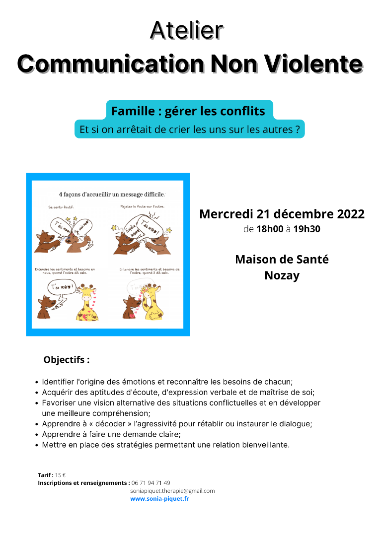Un des objectifs des ateliers CNV que j'anime, est de former les adultes pour que les enfants apprennent par imitation. Les parents repartent avec des pistes concrètes pour gérer le conflit et communiquer avec bienveillance afin de construire une relation respectueuse. Ce n'est pas céder à toutes les envies et pulsions incontrôlées de nos enfants, c'est leur transmettre des valeurs, tout en fixant des limites, sans avoir recours au chantage, à l’intimidation, culpabilité, violence (physique ou verbale) ou à la punition.